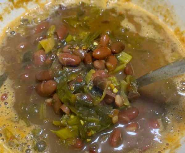 最后是一碗南瓜汤和一碗红豆汤,都是云南人爱吃的家常菜,南瓜汤不需要多余的调料,只需要把南瓜煮熟就可以,清清淡淡香甜可口,吃起来清爽而不油腻,比喝糖水还香甜。而红豆汤则需要和酸菜一起搭配,本地的红豆加上酸爽的酸菜,煮到熟透就可以吃了,里面还加了辣椒,酸酸辣辣喝完浑身都暖暖的,这样的红豆汤喝多少都不会腻。