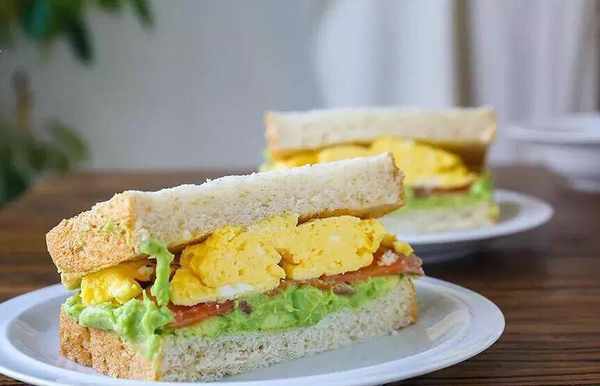 取一片面包,抹上牛油果泥,放上番茄片、黄瓜片和火腿肠片,盖上另一片面包。
