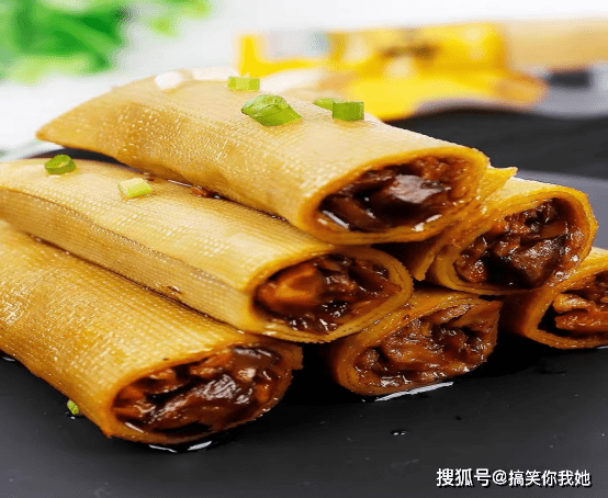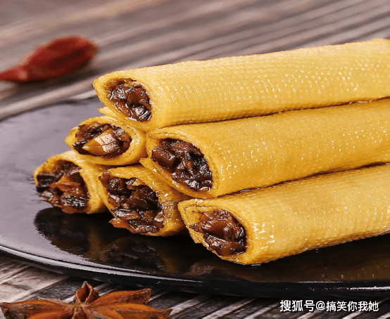 香菇豆卷就突发奇想,将美味的香菇干做成夹心,夹在软嫩的豆卷里,经过十八道工艺和二十多种香料的慢火卤制,香菇豆卷夹心看起来咸香透亮,十分诱人。
