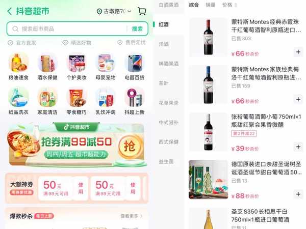 今年1月,抖音平台在APP内上线“抖音超市”,目前还未有可直接进入端口,可以通过搜索找到。在“抖音超市”首页显示的九大品类中包括了“酒水保健”,截至目前“红酒”品类的产品链接有36个,干红和干白类平均券后价格不超过200,价格醉高的一款产品是张裕生产的冰酒目前暂未出单,销量醉高的则是一款券后售价66元的蒙特斯干红。