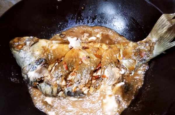 3.锅中下入两勺黄豆酱炒出香味,倒入啤酒没过鱼身,大火烧开后加入白糖少许提鲜,倒入少许一品鲜酱油调一下汤汁颜色,然后转小火慢炖。