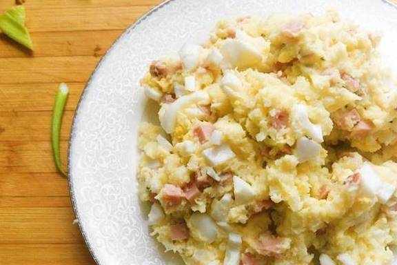 步骤1:把土豆放在蒸锅里蒸大概10分钟左右,蒸到土豆绵软熟透。中间可打开蒸锅盖子,用筷子插土豆检验是否熟透,一定要蒸到土豆完全变软!步骤2:火腿切丁,鸡蛋煮至糖心(鸡蛋放到凉水中,大火烧开后转小火煮五分钟左右)切块,备用。步骤3:蒸好的土豆切块,用木槌捣成泥(一定越细越好!)加入少许牛奶,再次搅拌均匀,保证土豆泥的细腻。步骤4:将切好的火腿和鸡蛋加入土豆泥中,放沙拉酱、少许盐、糖、淋上一点白醋,拌匀,装盘(如果觉得味道淡,可放一些现磨的黑胡椒提味)。
