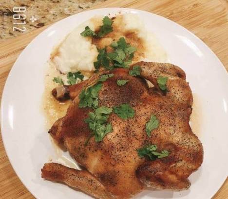 步骤1:将生抽酱油、蚝油、番茄酱、糖、料酒、蒜泥(比例大约是2:1:1:1:1:1,口味可自己把握,喜欢吃辣的可以放一些辣椒粉),混合搅拌均匀,放置一边备用。步骤2:小嫩鸡一只(不能买很大只的老鸡!)清空内脏,从鸡的腹部对半切开,冲洗干净,晾干备用。步骤3:将整只鸡放到一个食品袋里,防止腌的时候弄得很脏。将之前拌好的腌料倒入鸡肚子,带上手套将腌料均匀的涂抹到鸡的全身。步骤4:用手挤净袋子内的空气扎紧袋子口,放在冰箱冷藏室里放置3-4个小时。步骤5:烤箱预热,将腌制好的鸡放到烤盘上,稍微晾一下,用厨房用纸擦去表面的腌料,将黄油涂抹至鸡的表皮,撒上黑胡椒,进烤箱,180度上下火,烤大概30到40分钟(最后10分钟可以调到200度烤下表皮,如果怕糊了可以忽略这一步)具体时间根据烤箱的不同自行调整。烤的间隙可以用牙签插一下,看看有没有熟透。
