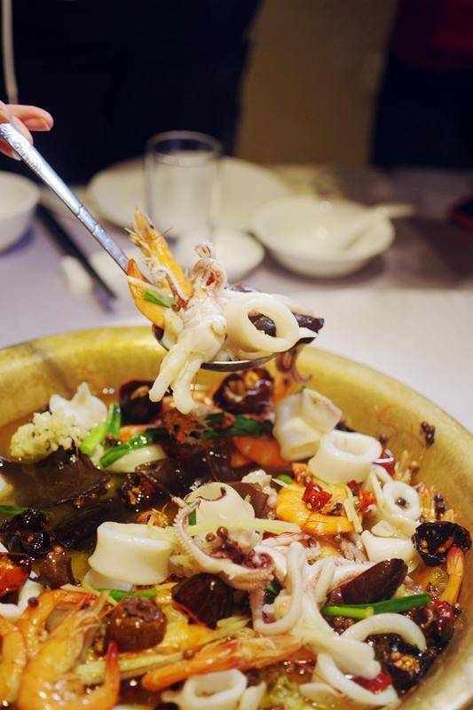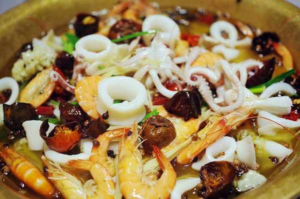 水煮香辣做法鱿鱼大虾更鲜香,鱿鱼爽脆Q弹虾肉鲜美,当年这道菜研发最重要是要达到三脆,配菜的木耳花菜和鱿鱼形成独特的三脆,吃起来会上瘾令人回味。难怪历经二十年还是如此受欢迎。
