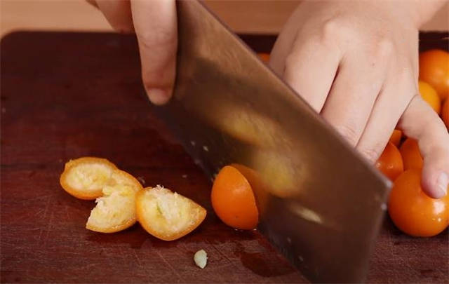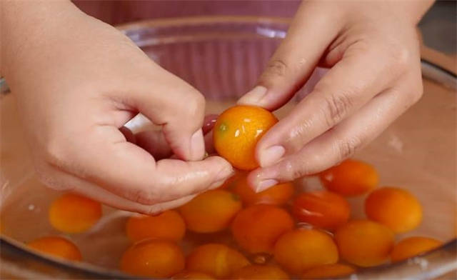 1.先把金桔放在清水里,加入一勺盐,把金桔清洗干净。