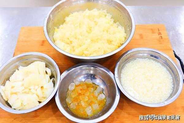 提前把银耳泡发,去除黄色的硬根后切成小块,银耳最好用凉水泡发,更容易炖出胶质;梨洗干净去除梨核、切成片;30克冰糖放入碗中,再倒入适量的桂花酱增加香甜味;另外准备适量的米酒备用。