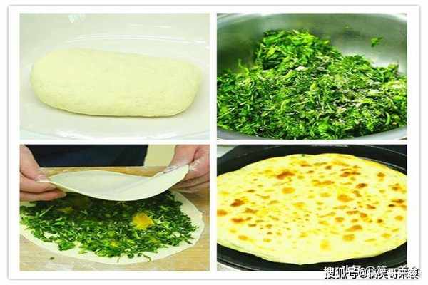 饧好的面取出来,稍微揉几下子,然后搓条、揪面剂子、擀面片子,尽量中间厚两边薄省的露馅。擀好以后铺上一层荠菜,磕上一个母鸡蛋,再拿个面片往上一盖,用个圆盘轧一圈,这饼坯子圆溜溜类、严丝合缝,丝毫不用担心流汁。