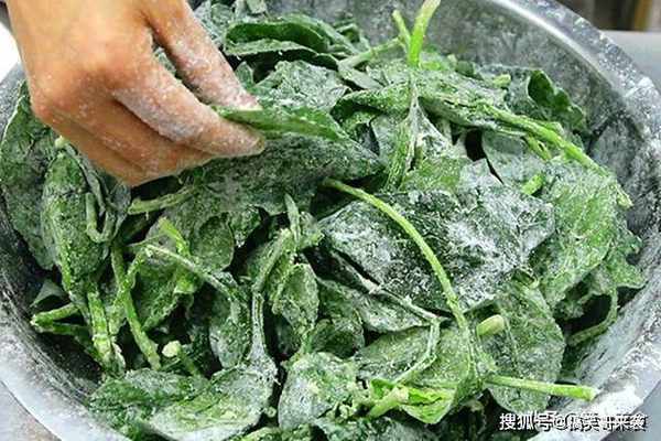 首先,我们把菠菜洗净,控干水分放在盆中,淋上一勺子植物油用手焯匀,植物油能防止菠菜出水粘连, 撒上少许食盐调味,然后抓入适量的面粉,不需要太多,每一片菠菜也都挂上面粉就行了,太多了容易粘一块。如果介意菠菜叶中的草酸,可以迅速焯水,捞出控干水分以后再用植物油拌。