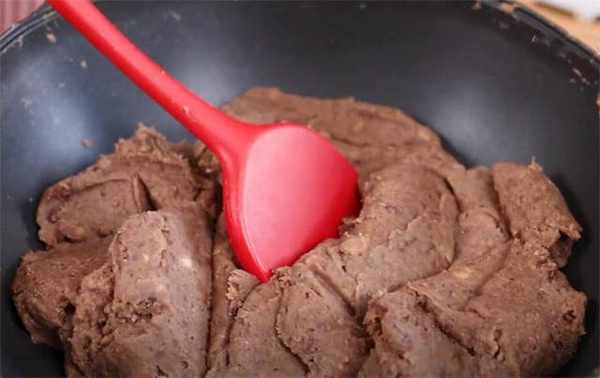 4.刚打出来的豆沙馅含水量比较多,所以前期的时候不用放油,直接下锅,全程小火,把里面大部分的水分炒出来之后,我们就要加少许的食用油,继续炒到豆沙馅开始抱团的时候,我们把剩下的一小部分豆沙放进去。