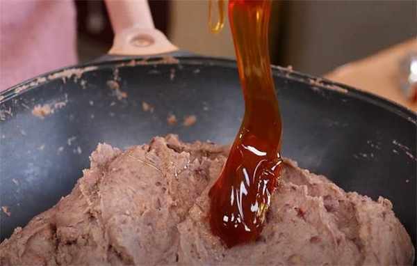 5.把两种豆沙完全搅匀之后,添加一些红糖,再按照自己的喜好添加白糖,加上一部分的麦芽糖,这样就算凉了之后也不会开裂。