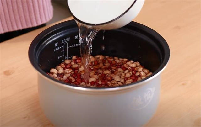 2.豆子已经泡发了,这里加水的时候不用加太多,按煮饭键煮熟。