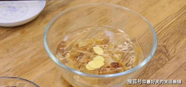 3.蒸软后,倒出碗里,再倒入适量清水,几片生姜,放入冰箱泡发一晚上。