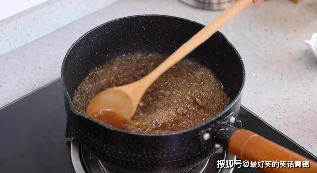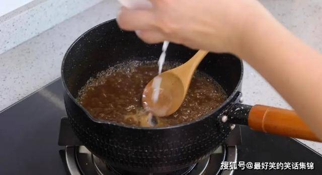 4.起锅倒食用油,再放入冰糖,炒个糖色,冰糖全部融化后,倒入适量清水,煮至冒密集小泡后,关火备用。