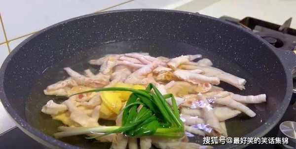 5.鸡爪冷水下锅焯水,放入葱结、姜片、料酒去腥。