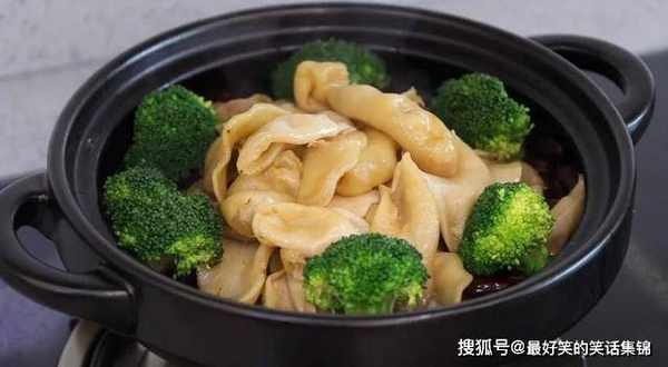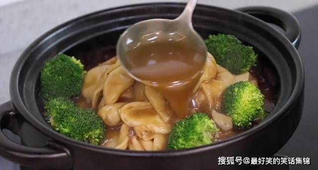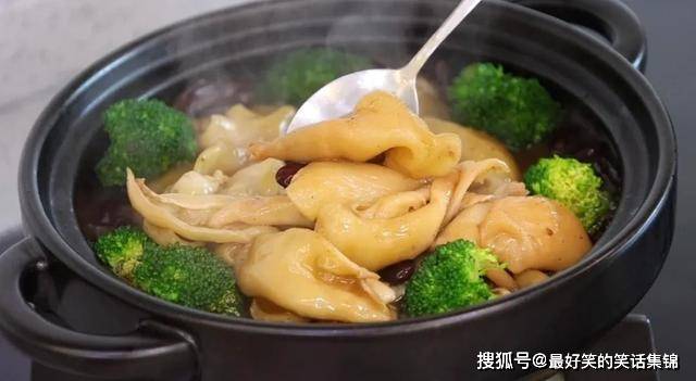 10.捞出花胶,放到装油腰豆的砂锅里面,再摆上几朵西兰花做点缀。