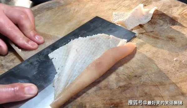 2.放菜板上用刀将多余的油脂刮干净。