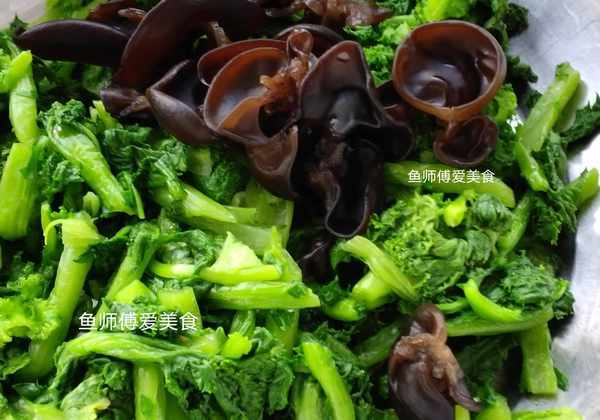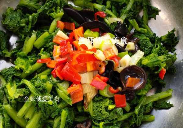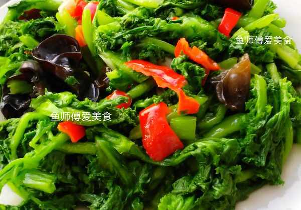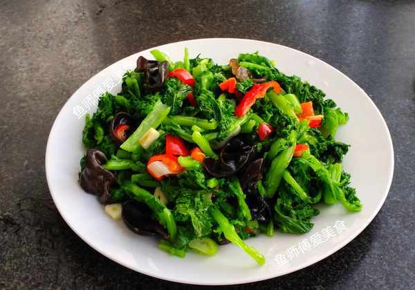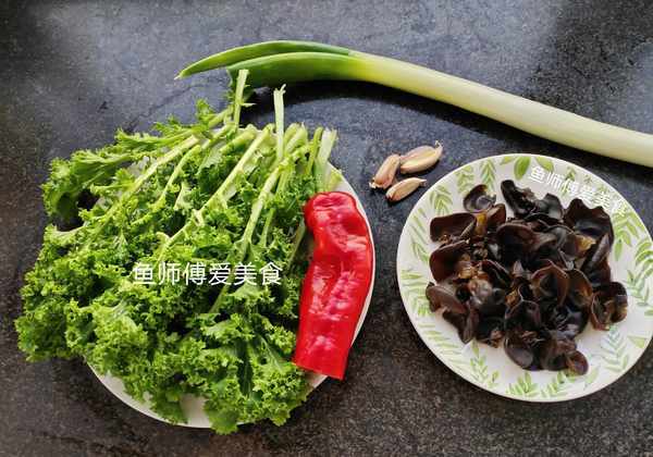 食材:苔菜,木耳,红椒,葱,蒜,食用油,食盐,白糖,味精。