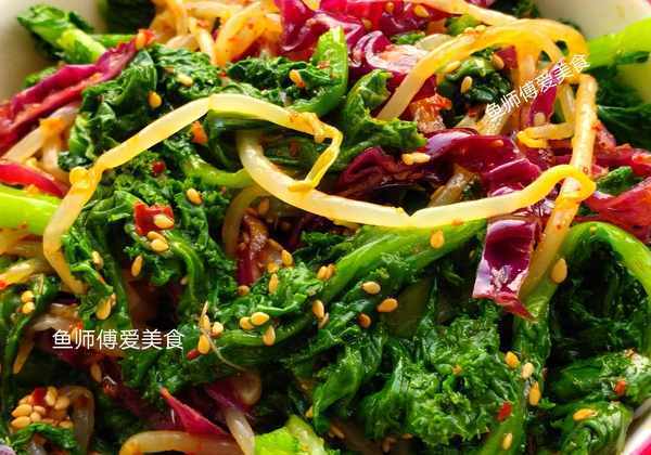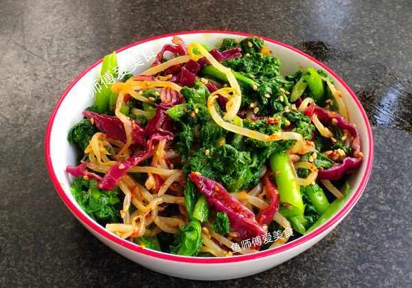 食材:苔菜,甘蓝,豆芽,蒜,白芝麻,辣椒油,食盐,味极鲜酱油,醋。