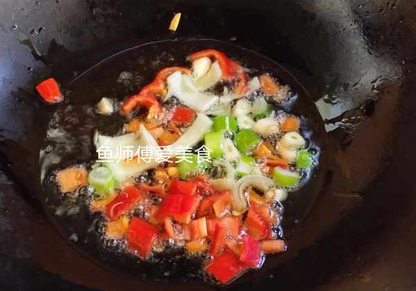 4.锅中倒入食用油,下入葱,蒜,红椒,炸出香味。能吃辣的就用朝天椒,不能吃辣的就用甜椒,这样可以提味,也能使做好的菜,色泽更美观。