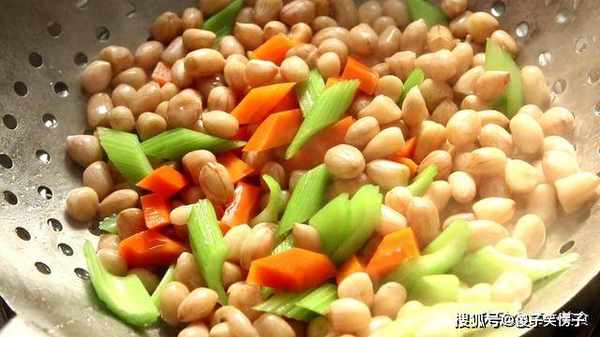 胡萝卜半个先切成小块,芹菜两根切成小块,芹菜和胡萝卜可以为菜品增色,然后把泡好的花生捞出备用。