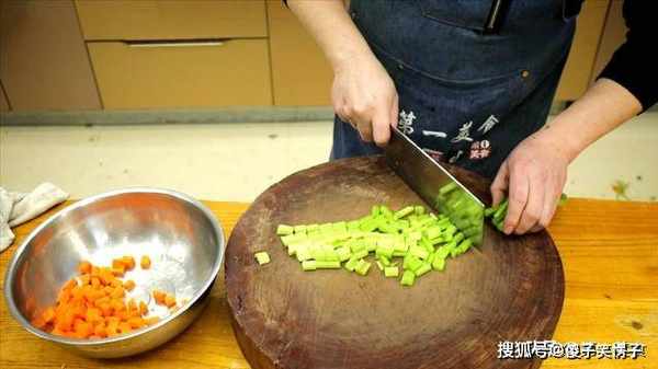 3分钟以后,倒入芹菜和胡萝卜,继续焯水30秒,芹菜和胡萝卜断生以后倒出,用清水冲洗冷却控水,清水冲洗,食材口感更脆颜色鲜亮。