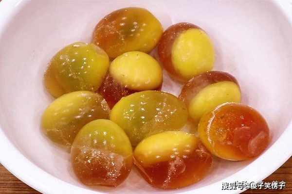 这是我们前段时间自己做的变蛋,拿出来几个,把外壳剥掉,看一下变蛋金黄金黄的、蛋清晶莹剔透。