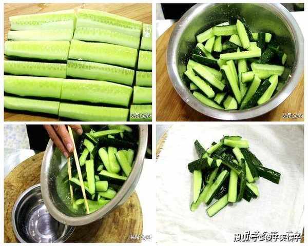 。把切好的黄瓜放入盆中,加入3勺食盐、颠盆拌匀腌制10分钟。黄瓜