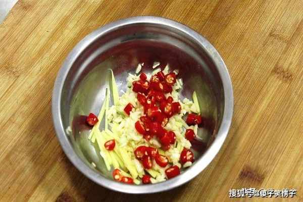 准备生姜一小块,切成细丝;大蒜几粒,拍散后切成末;小米椒几个,切成小段放在一起备用。