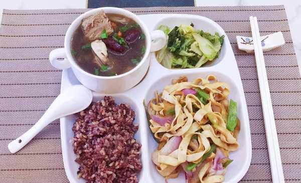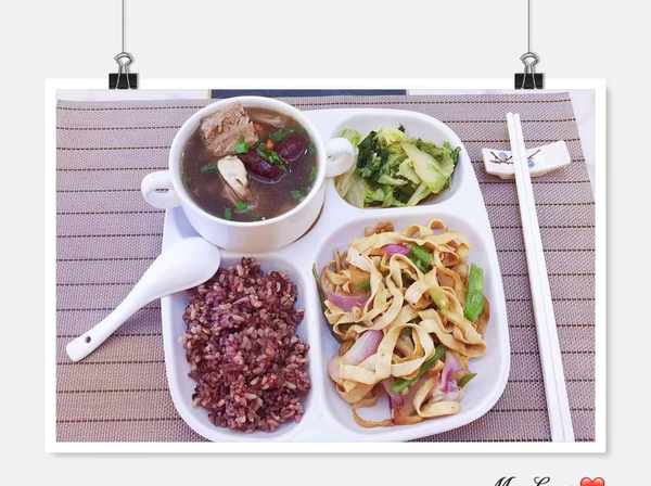 午餐:排骨口蘑汤、洋葱炒豆腐皮、油醋汁大白菜、杂粮饭。