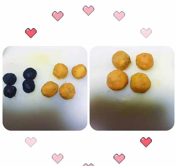 2. 红薯洗干净去皮切片,上锅蒸熟压成泥,分成四份搓成圆球,取3勺五黑熟粉(五黑粉是黑豆、黑芝麻、黑桑葚、黑枸杞、黑米。)五黑粉加适量牛奶搅匀,搓成四个小圆球,红薯球按扁,将五黑球包起来压扁,锅中刷油,将饼煎一煎。