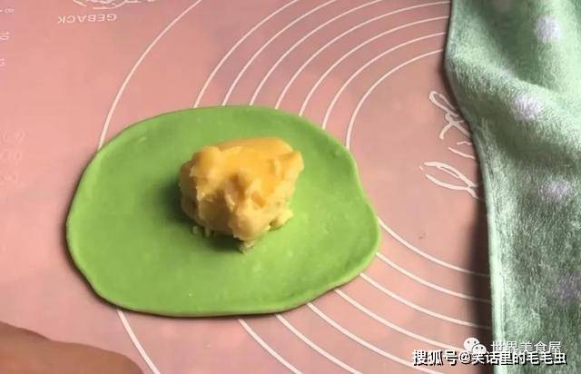 ⑦将团子擀开成面皮,中间包裹黄豆泥馅料,里面的馅料可以自己在外面买,喜欢吃什么放什么。