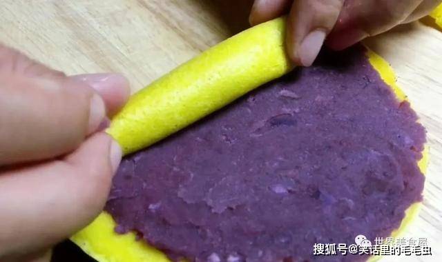 ⑨在鸡蛋面皮上,放一层紫薯泥,随后卷起来。