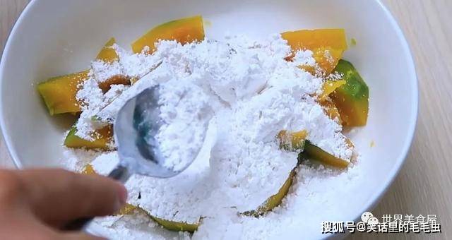 ②蒸熟的南瓜放碗中,混入糯米粉搅拌。