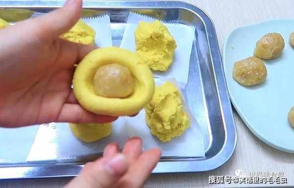 ⑧接着将面团分成效,搓成圆,中间捏一个窝,放入馅料,包裹起来。