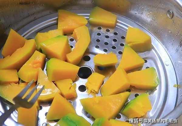 ①先将南瓜切块,上锅蒸熟。