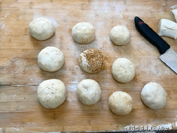 8、用切菜刀分成均等的面剂,每一个面剂,还需要重新加工一下,将两端捏紧收口,用手轻轻压扁,得到的就是烧饼生胚了,抹点清水,粘上白芝麻。