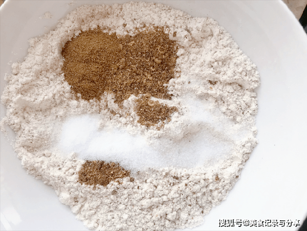 3、接下来是制作油酥的步骤,准备一个空碗,加入30克面粉,半勺花椒面、半勺五香粉、半勺食盐,搅拌均匀。