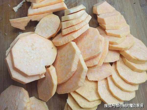 2、处理红薯,削皮洗净,切成薄片上锅蒸熟,大约15分钟就行,用筷子可轻松扎透。