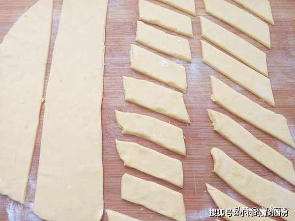 7、用擀面杖擀成一张大薄片,约0.5厘米的厚度,用刀分成菱形的样子。