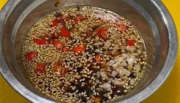 2.蒜瓣,辣椒洗净。洗净后的蒜剁碎,辣椒切成段,切好放碗中备用。碗里面加入适量的芝麻,芝麻要选用熟芝麻,然后倒入热油刺发香味,加入食盐,白糖,蚝油,酱油,用筷子给它搅拌均匀放在一旁;