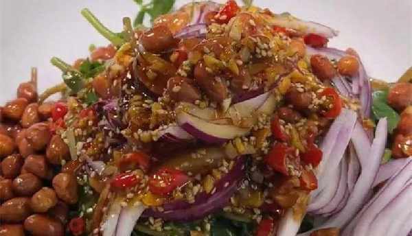 4.锅中加入水,一勺食用油,然后将洗净后的马齿苋放入锅里面用水焯一下。焯水后的马齿苋捞出放在盆中,把洋葱圈倒入,接着花生米也放在上面;
