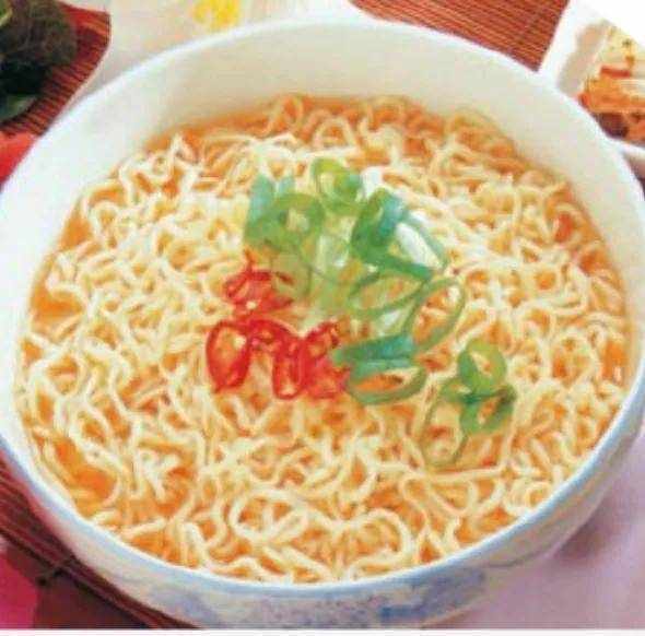 ②把炸好的面条加入开水中煮熟,再加汤加入调味料,到入碗中,表面放上红椒圈、葱叶圈、辣白菜段、萝卜泡菜,即可食用。