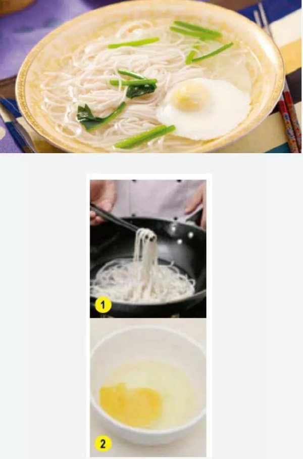 [材料]中筋面>条500克,鸡蛋5个,菠菜50克,香油2大匙,精盐1大匙,猪肉汤300克。
