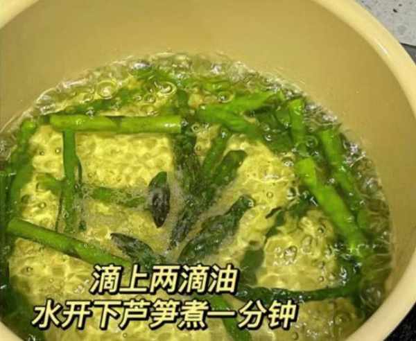 第二步:另外起锅煮一些清水,滴入两滴橄榄油,加上一小勺食盐,倒入芦笋焯水一分钟,用冷水冲洗干净,沥干掉水分。