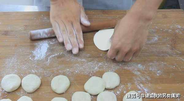在面剂上撒上面粉,用手翻匀。如图所示,把面剂子擀成中间厚边上薄的面皮,多练习几次,都能擀得好 。