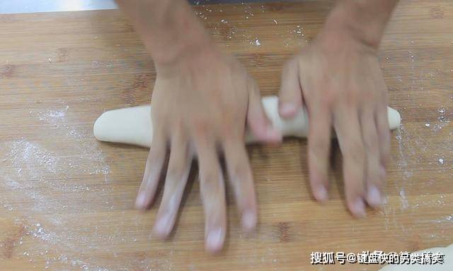 把面团放在案板上面揉搓挤压,内部没有蜂窝,然后一分为二,再揉成长条状。