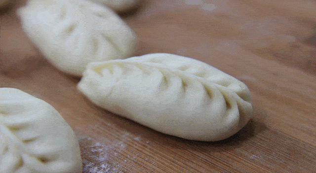 每次折合一点,左右交替,慢慢的捏成一个长条包子,就这样一个一个的包好所有的包子,整齐摆放在案板上 。