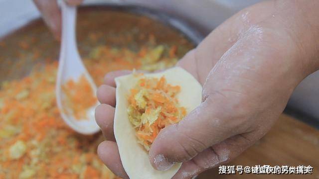 把所有的面剂子都擀成面皮。再把胡萝卜馅包在面皮里面。