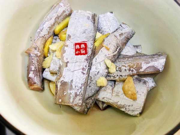 当然我们这边也只能买到冷冻的带鱼,所以买回来第一件事情就是解冻,然后清洗干净,里面的黑膜一定要洗干净,要不腥味真的很多。洗好之后放大碗里面,加姜蒜料洒盐腌制半个小时左右。