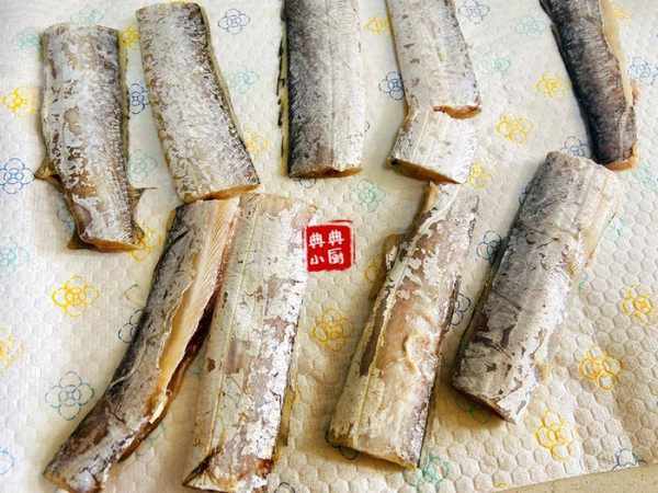 腌制好的带鱼放到厨房纸上面吸掉多余的水分。然后放到面粉里面滚一下备用。
